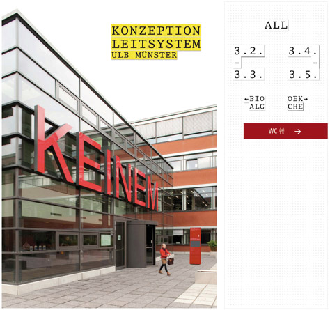 Im Auftrag von DBCO entstand für den Pitch des Leitsystems der ULB Münster ein detailliert strukturiertes Designkonzept zur Signaletik. Das entwickelte Orientierungsdesign ist flexibel und geht auf die unterschiedlichen Anforderungen der ULB Münster optimal ein. Es basiert auf einem Stecksystem aus zwei verschiedenen Grundmodulen mit Rasterbohrung. Auf diesen Grundmodulen, können alle Leitinformations- ebenen aufgebracht werden. Rot lackierte Metallschilder dienen zur Ausweisung der unveränderlichen Orte. Einzelbuchstaben, mit schwarzer Schrift auf weiß oder gelb lackierten Hintergrund, für alle variablen Informationen.